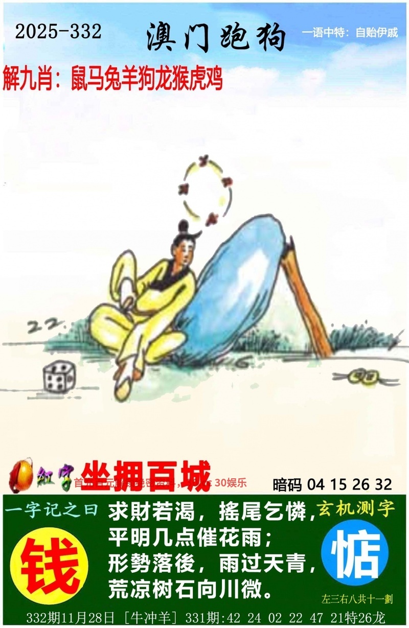 玄机诗:求財若渴,摇尾乞憐,平明几点催花雨。形勢落後,雨过天青,荒凉树石向川微。